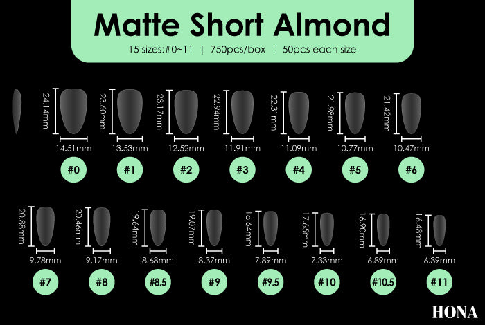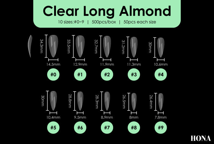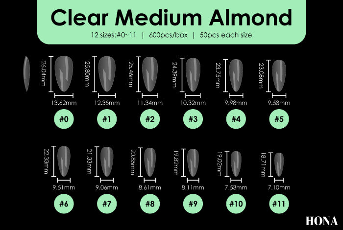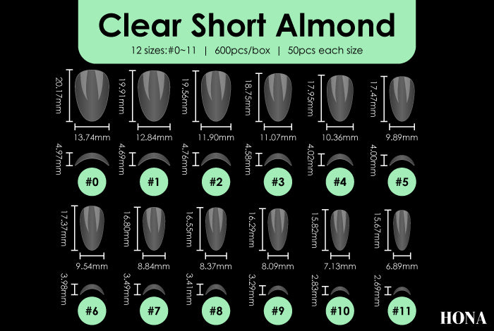 Clear short Almond tip measurementsClear medium Almond tip measurementsClear long Almond tip measurementsMatte short Almond tip measurementsMatte Medium Almond tip measurements