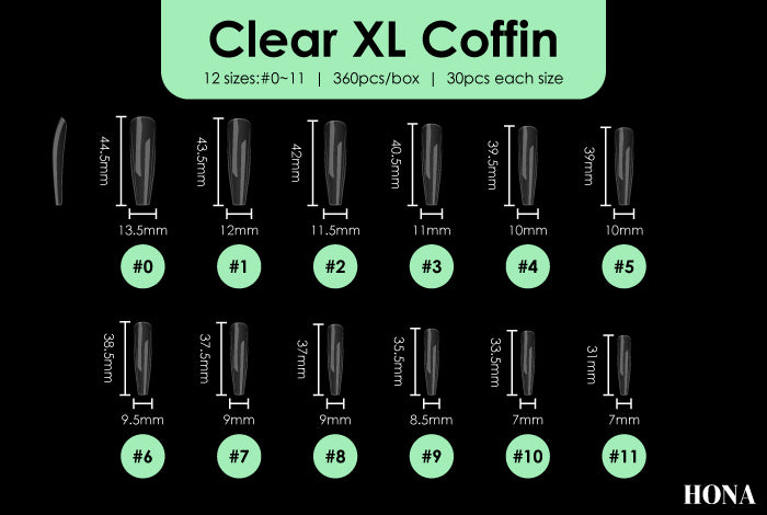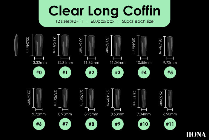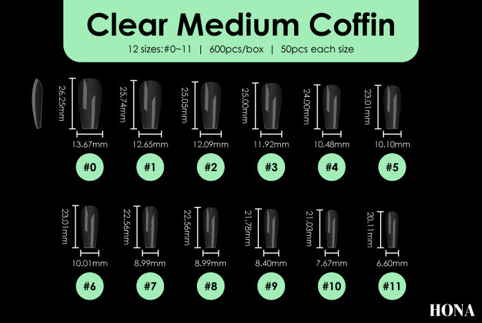Clear Short Coffin tip measurementsClear Medium Coffin tip measurementsClear Long Coffin tip measurementsClear XL Coffin tip measurementsMatte Short Coffin tip measurementsMatte Medium Coffin tip measurementsMatte Long Coffin tip measurements