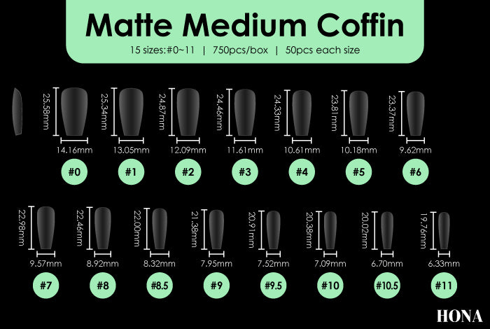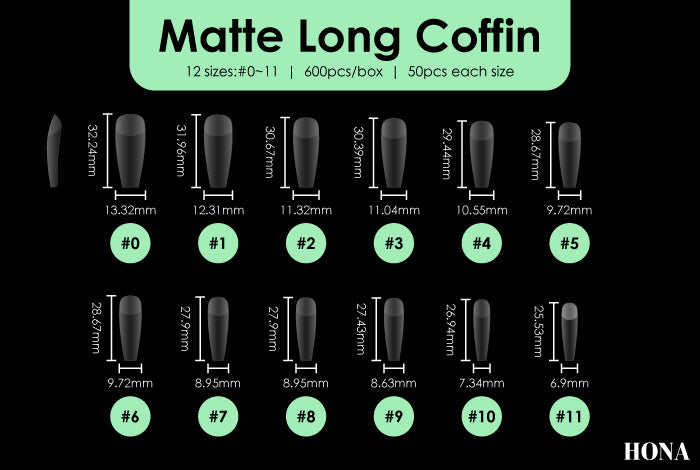 5. Product Specifications: Each box of Coffin SwiftTips contains at least 600 ( Matte coffin short and medium has 750) tips in short, medium, long and extra long lengths. For detailed information on sizes, quantities, and application methods, please refer to the information provided below.