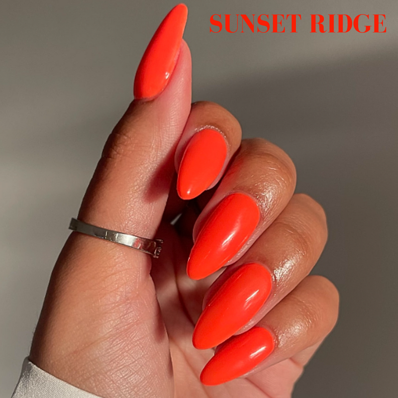 Sunset Ridge gel polish from the Rodeo Nights collection is a bold and bright electric orange shade that captures the firey essence of a summer sunset. Its electric orange hue is sure to turn heads!