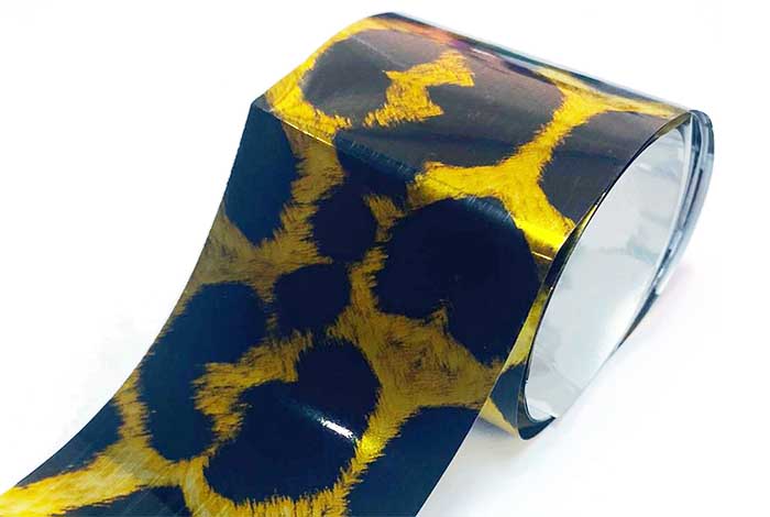 Golden Cheetah Print has a high gold shine with back throughout in the style of a cheetah print - it is reasonably detailed so would suit full coverage or partial coverage.