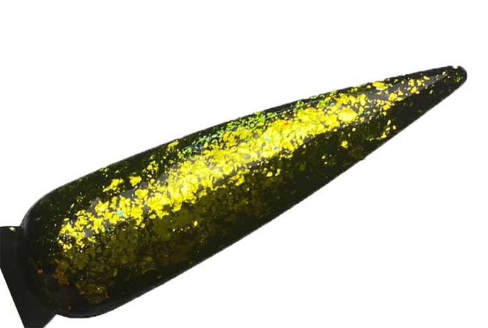 Helios is a bright yellow lime gold nail art flake that gives an incredible look to nails. This premium and super-soft flakes will melt into a tacky layer of gel polish giving an impressive finish.