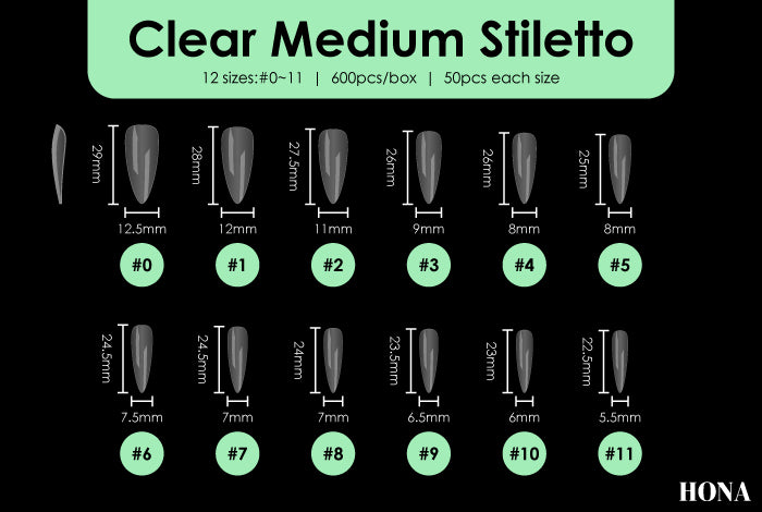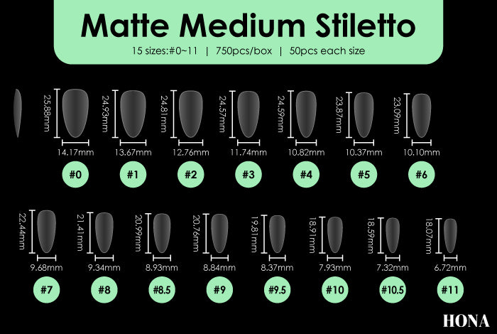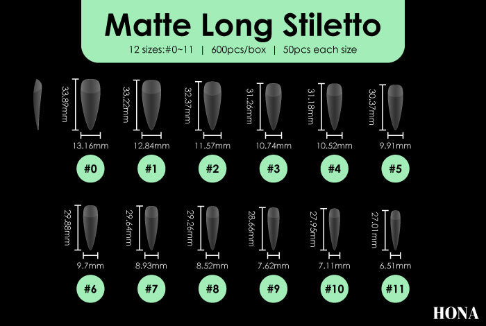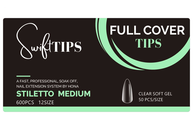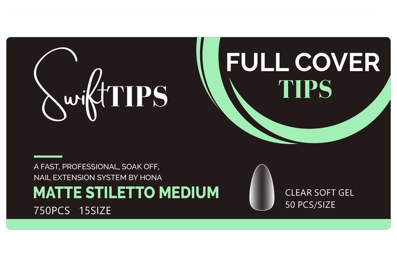 Product Specifications: Each box of Stiletto SwiftTips contains 600 tips in all shapes except for medium matte which has 750. For detailed information on sizes, quantities, and application methods, please refer to the information provided below.