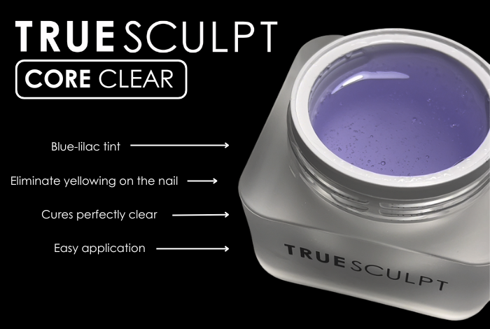 Introducing our award-winning innovative Core Clear TrueSculpt, HONA's all-rounder when it comes to hard gel. Core Clear was designed with a purposeful blue-lilac tint to push the boundaries of gel chemistry. Much like how purple shampoo neutralises yellow tones in hair, this tint works to eliminate yellowing on the nails, keeping them bright and with a glowing healthy appearance. The subtle lilac/blue tint not only ensures the gel cures perfectly clear but also makes application easier by allowing you to see its placement more clearly during application.